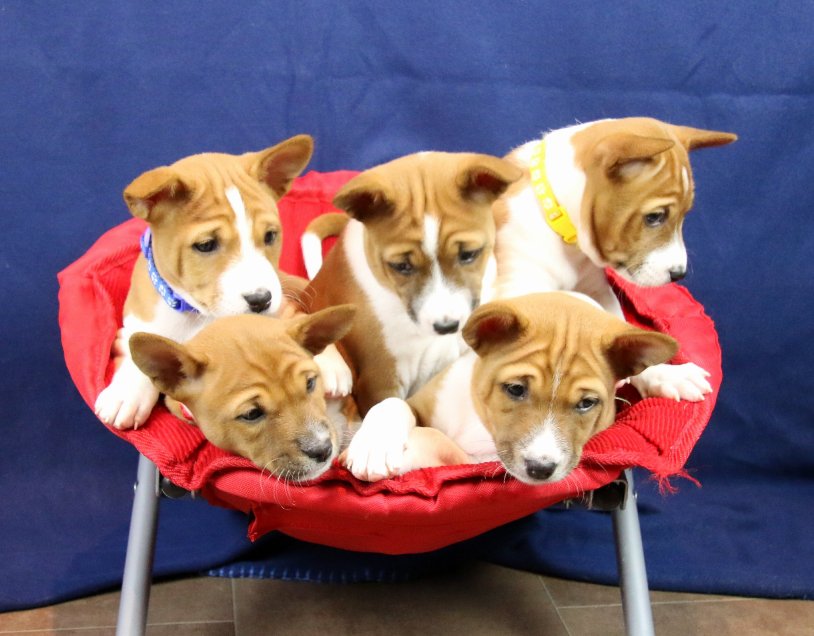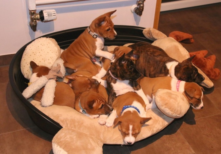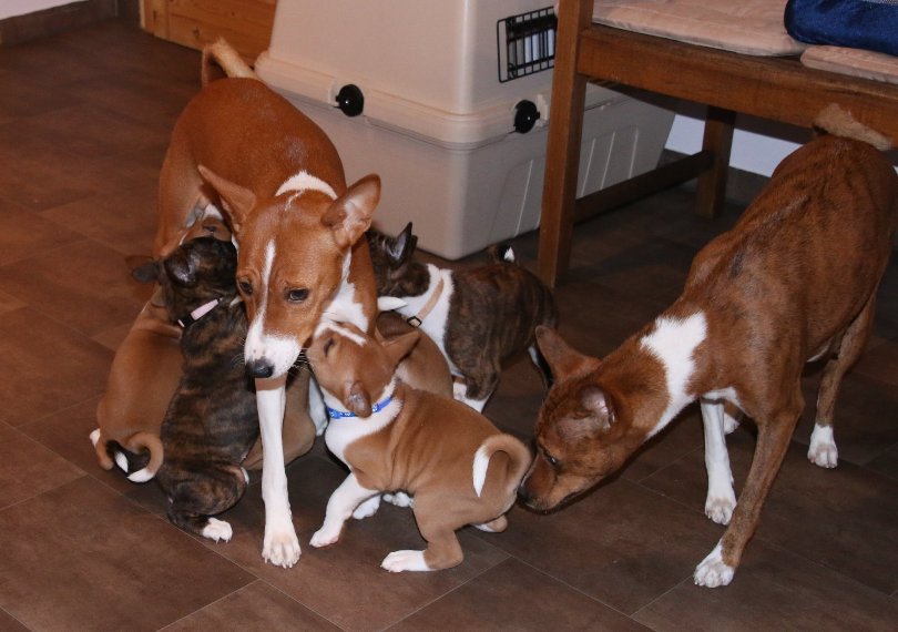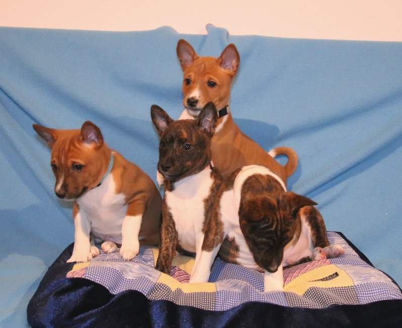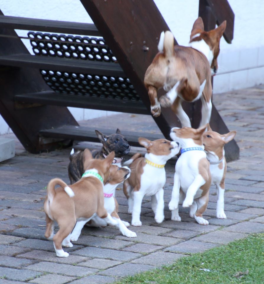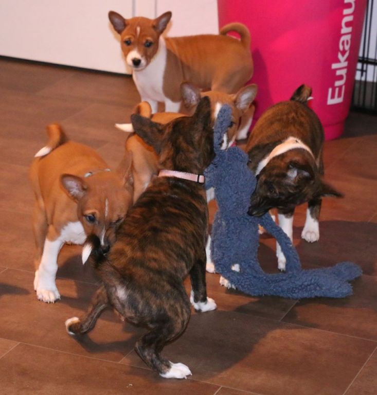 Nun sind die Z's schon sieben Wochen alt und wird immer schwieriger ein gescheites Gruppenfoto der Bande zu bekommen, denn ganz basenjitypisch haben sie nun alle ihren eigenen Willen und wollen nur machen wonach ihnen der Kopf steht und still sitzen, wenn man doch hellwach ist, steht da ganz und gar nicht auf dem Programm. Aber ich glaube, es ist uns trotzdem wieder ganz gut gelungen.