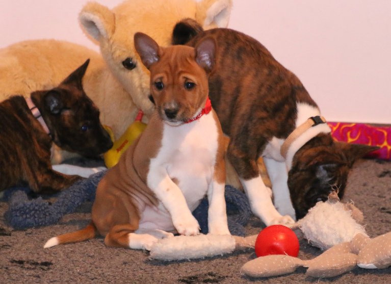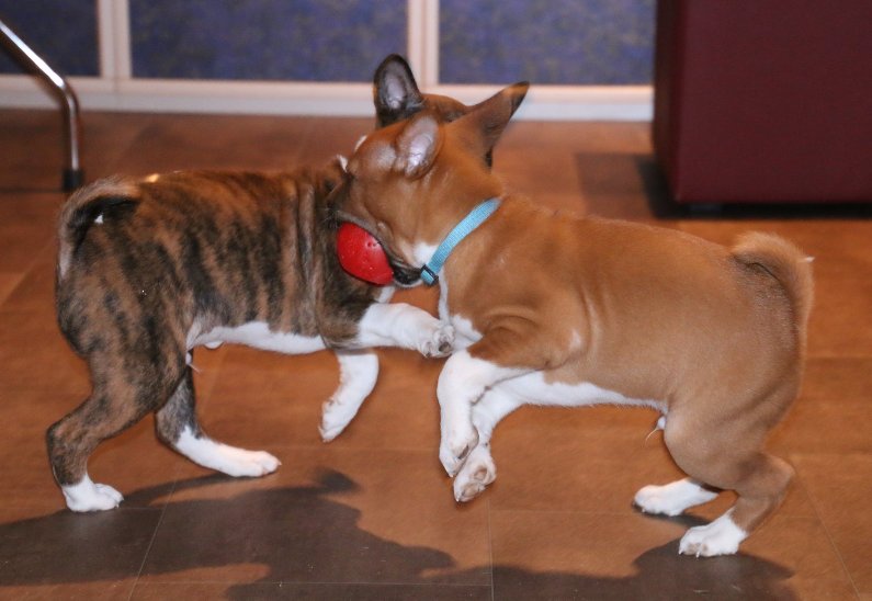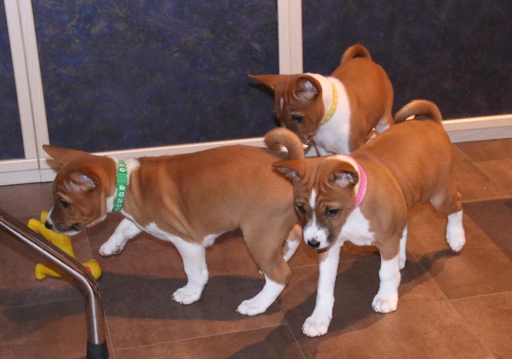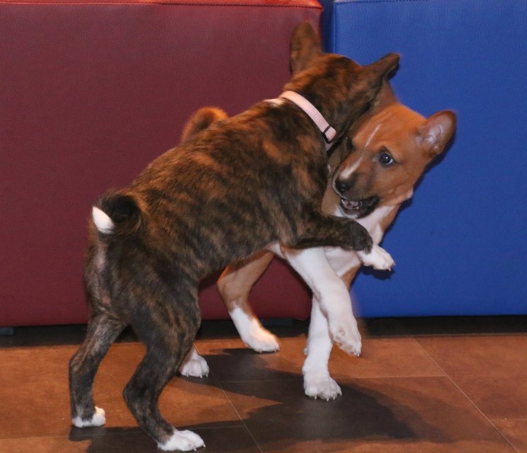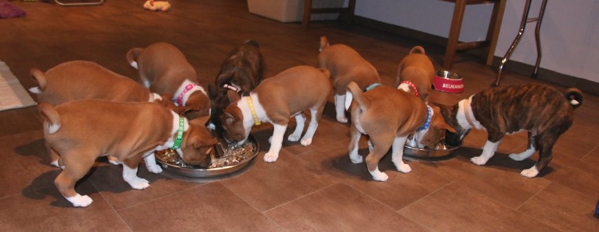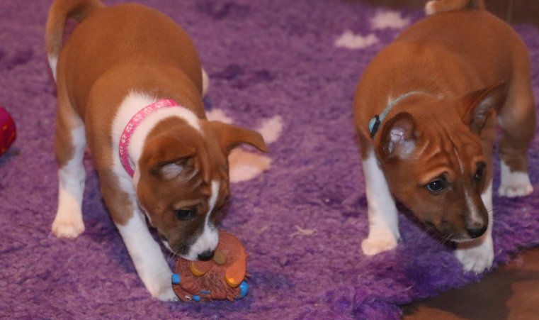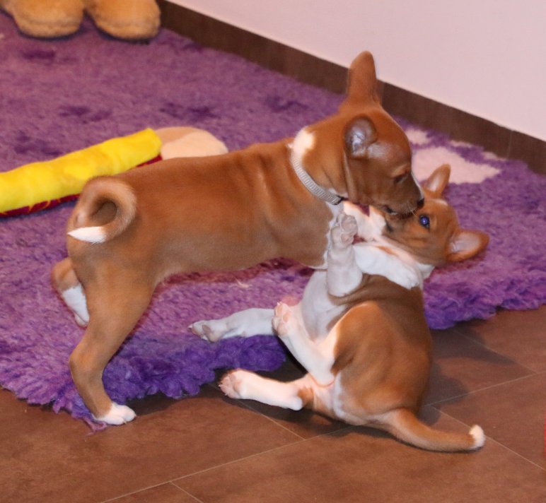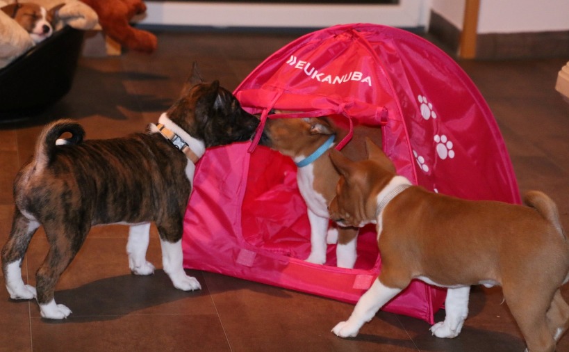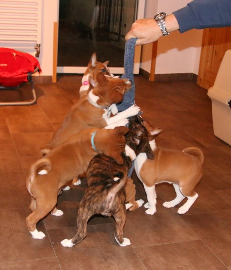 Die A's sind heute sieben Wochen alt geworden, das heißt gleichzeitig, die letzte gemeinsame Woche der A und Z Welpis ist angebrochen. Die vergangenden vier Tage haben die Welpis mit massenweise Besuch verbracht, eins kann man mit Sicherheit sagen, scheu gegenüber fremden Menschen sind sie absolut nicht. Jeder wird freudig begrüßt und kurz drauf wird an Finger, Zehen, Hosen, Schals oder Haaren geknabbert. Sie haben jetzt schon richtig Kraft und müssen lernen, wann sie zu weit gehen. Ausdauernd sind sie auch, das Akku reicht bereits locker für sechs Spielheiten á 1,5 Stunden pro Tag. Sie sind basenjitypisch ausgesprochen neugierig und nichts ist mehr vor ihnen sicher. Ihr Apetit wird auch von Tag zu Tag größer. Nachts sind sie aber extrem ruhig und müssen sich scheinbar ausgiebig erholen. Wir haben uns nun auch endlich entscheiden können wer wer ist und können nun endlich alle Rufnamen zuteilen. Im Z-Wurf haben wir: Zeno (silber), Cosmo (beige), Nuka (türkies) und Zukie (rosa) und im A-Wurf: Rico (grün), Fuckel (blau), Imara (pink), Tano (gelb) und Fiby (rot).