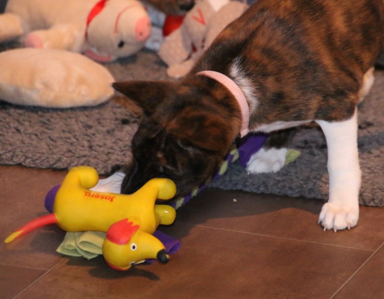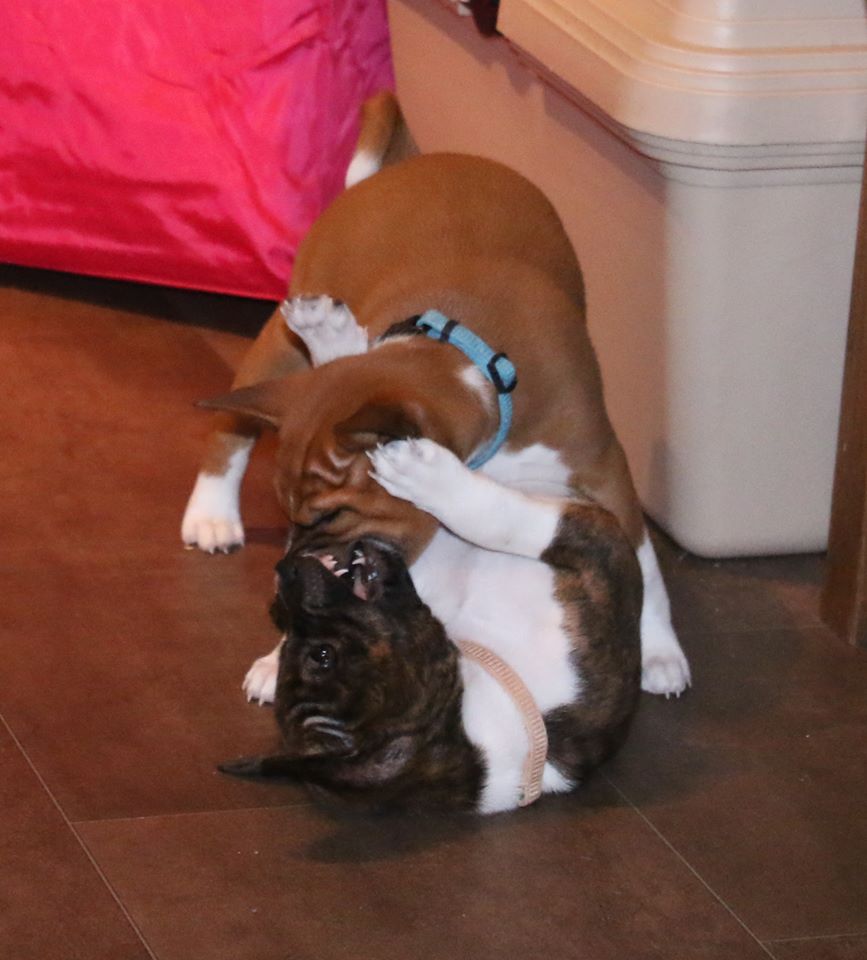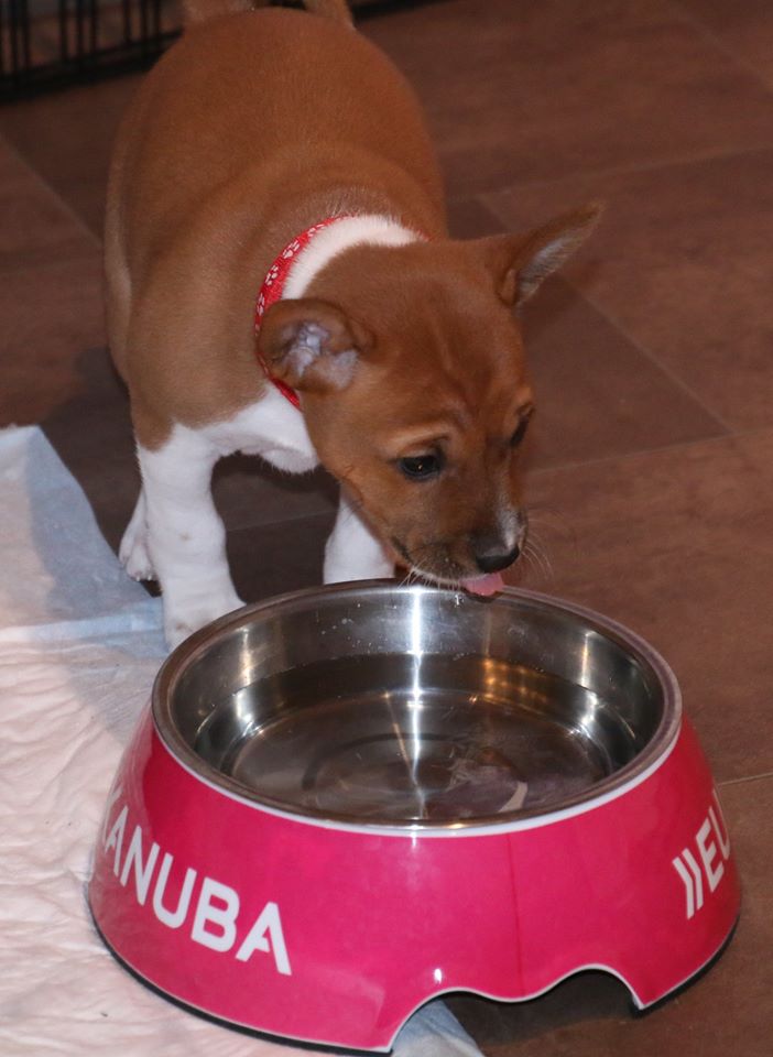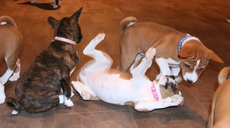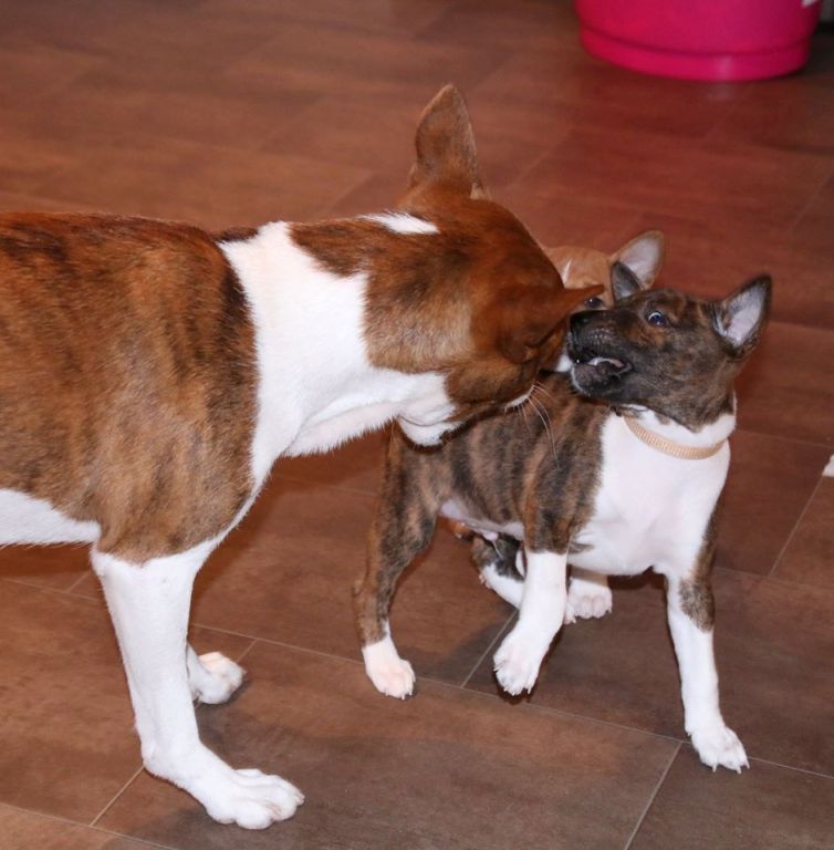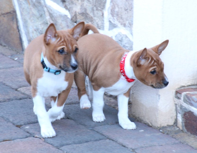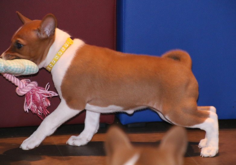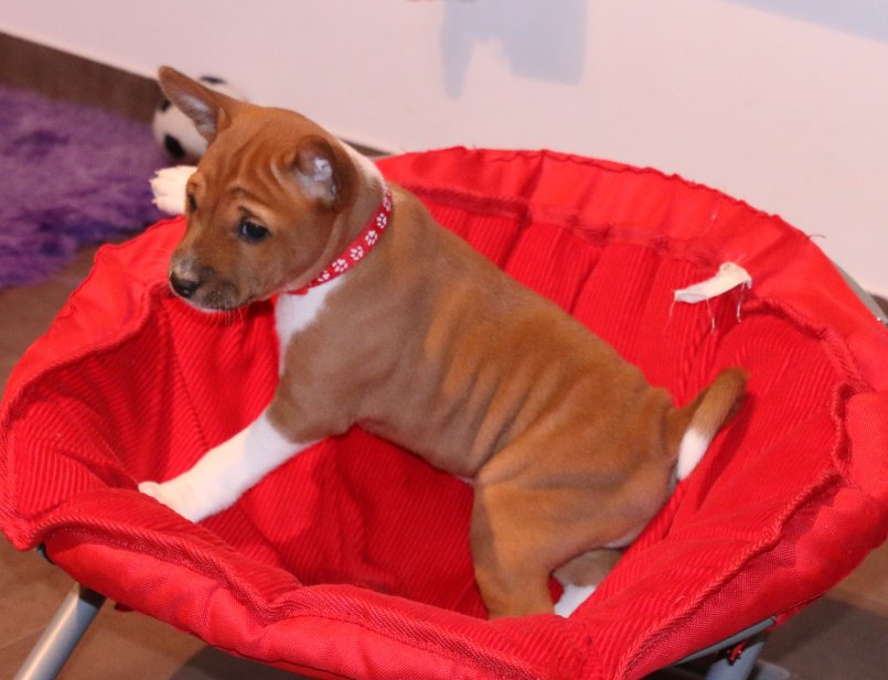 Die A's sind heute sieben Wochen alt geworden, das heißt gleichzeitig, die letzte gemeinsame Woche der A und Z Welpis ist angebrochen. Die vergangenden vier Tage haben die Welpis mit massenweise Besuch verbracht, eins kann man mit Sicherheit sagen, scheu gegenüber fremden Menschen sind sie absolut nicht. Jeder wird freudig begrüßt und kurz drauf wird an Finger, Zehen, Hosen, Schals oder Haaren geknabbert. Sie haben jetzt schon richtig Kraft und müssen lernen, wann sie zu weit gehen. Ausdauernd sind sie auch, das Akku reicht bereits locker für sechs Spielheiten á 1,5 Stunden pro Tag. Sie sind basenjitypisch ausgesprochen neugierig und nichts ist mehr vor ihnen sicher. Ihr Apetit wird auch von Tag zu Tag größer. Nachts sind sie aber extrem ruhig und müssen sich scheinbar ausgiebig erholen. Wir haben uns nun auch endlich entscheiden können wer wer ist und können nun endlich alle Rufnamen zuteilen. Im Z-Wurf haben wir: Zeno (silber), Cosmo (beige), Nuka (türkies) und Zukie (rosa) und im A-Wurf: Rico (grün), Fuckel (blau), Imara (pink), Tano (gelb) und Fiby (rot).
